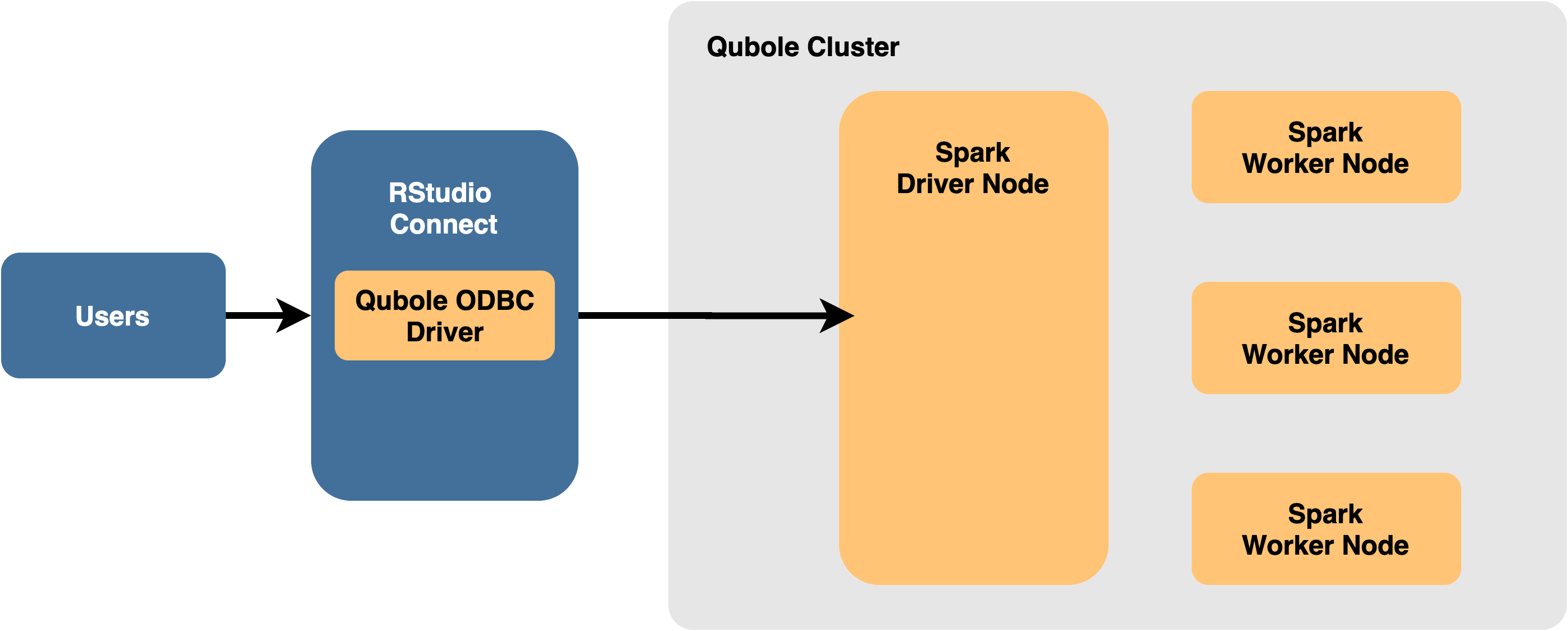 The best configuration for working with Qubole and RStudio Connect is to install RStudio Connect outside of the Qubole cluster and connect to Qubole remotely. This is accomplished using the Qubole ODBC Driver.