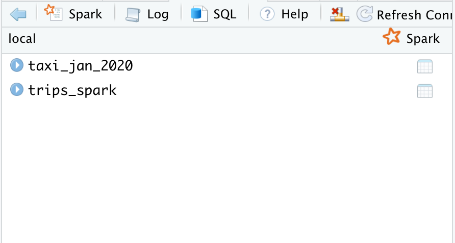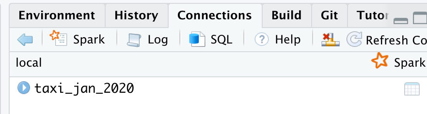 #> # tip_amount <dbl>, tolls_amount <dbl>, …In the RStudio IDE, the taxi_jan_2020 table now shows up in the Spark tab.