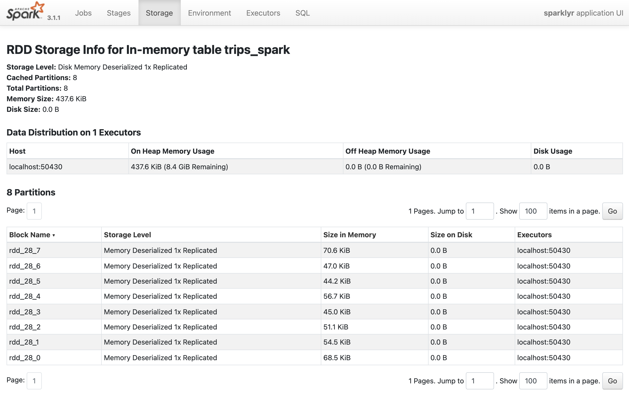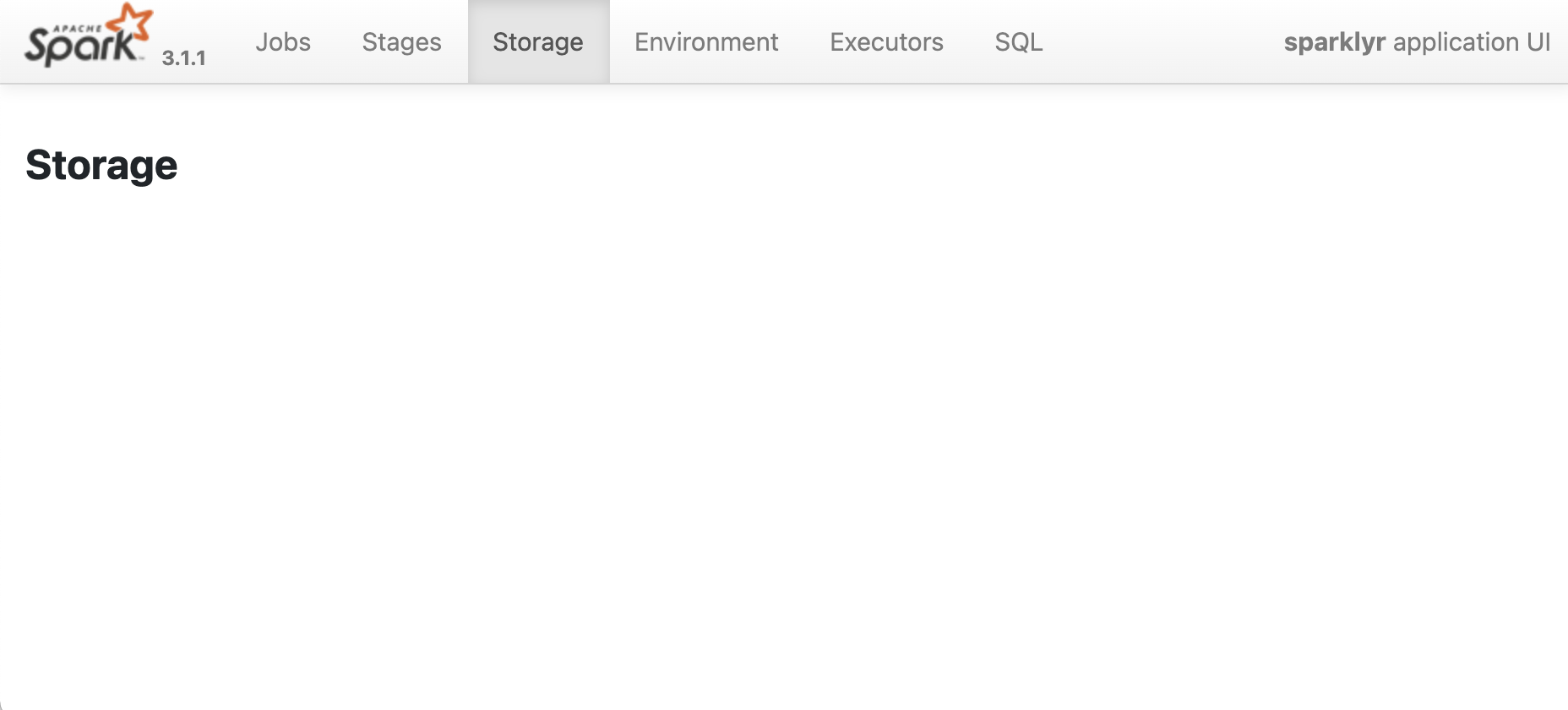 To access the Spark Web UI, click the Spark button in the RStudio Spark Tab. As expected, the Storage page shows no tables loaded into memory.