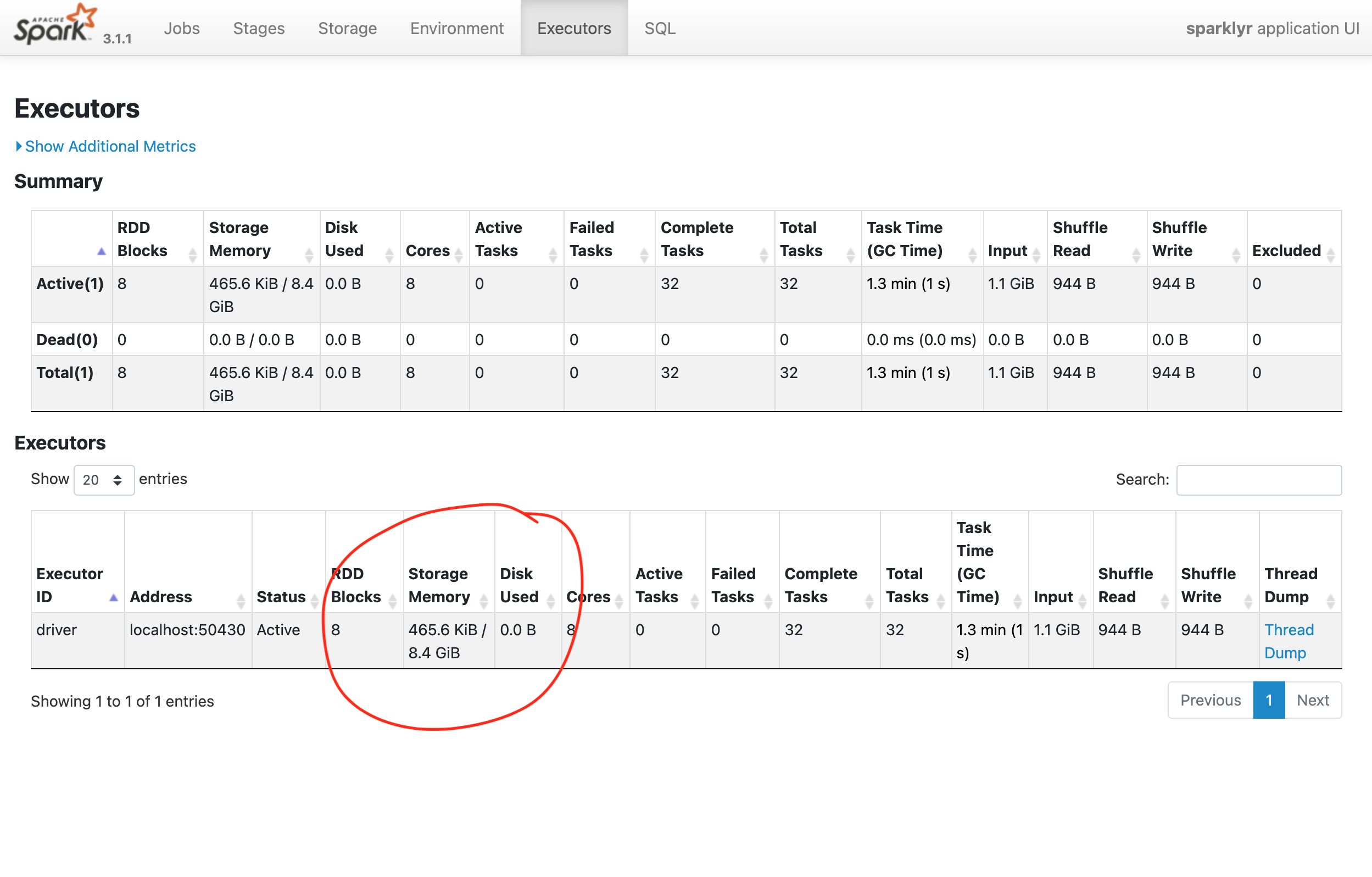 In the Executors page of the Spark Web UI, we can see that the Storage Memory is at about half of the 16 gigabytes requested. This is mainly because of a Spark setting called spark.memory.fraction, which reserves by default 40% of the memory requested.