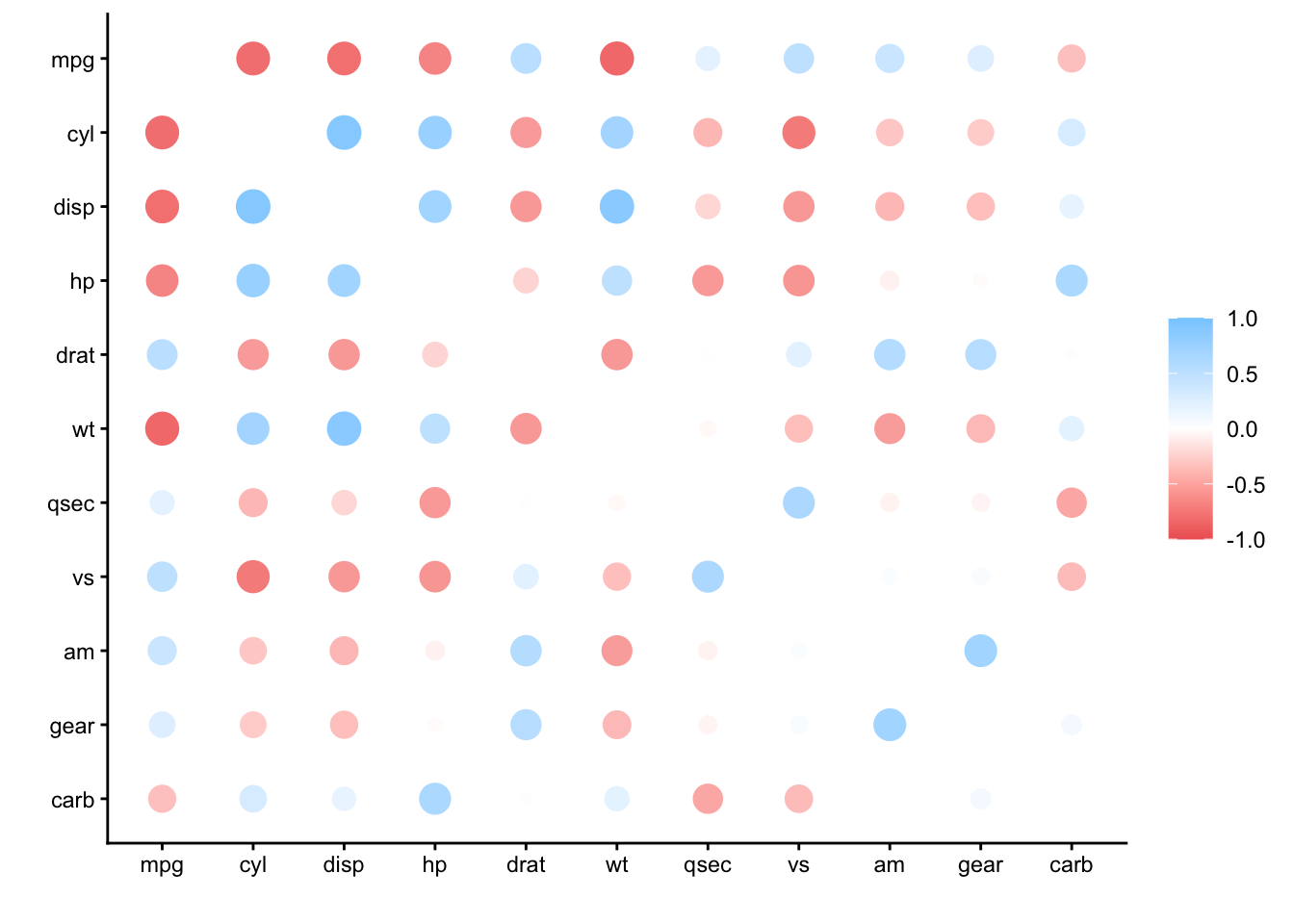 #> # carb <dbl>rplot() provides a nice way to visualize the correlations. Again, because corr_mtcars’s data it is currently locally in R, plotting requires no extra steps: